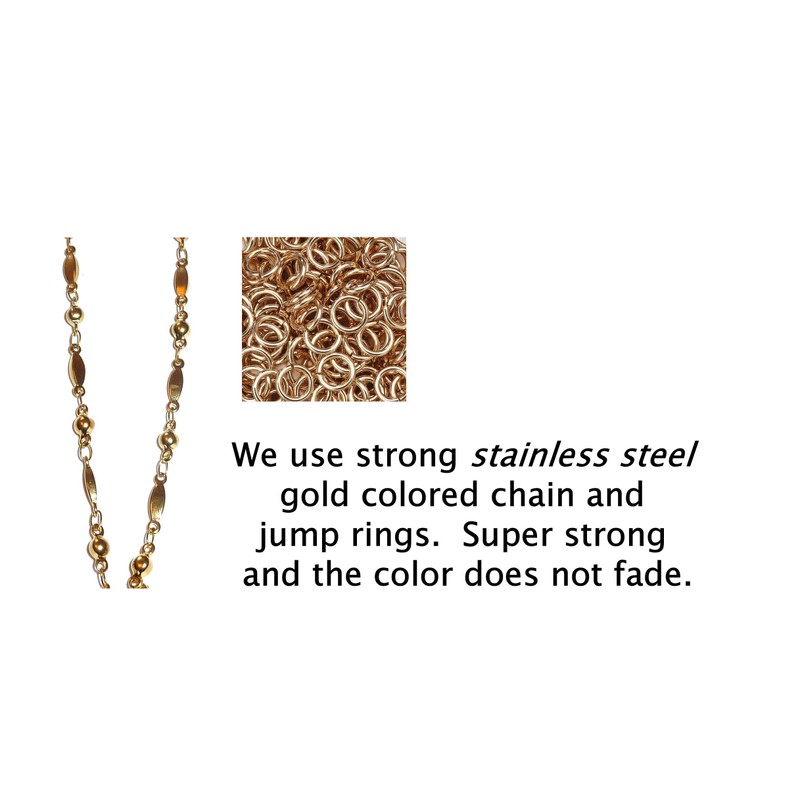 - Acero inoxidable: este cordón está hecho de cadena de acero inoxidable y anillos de salto. Esto significa que nunca cambiará de color y es súper fuerte.