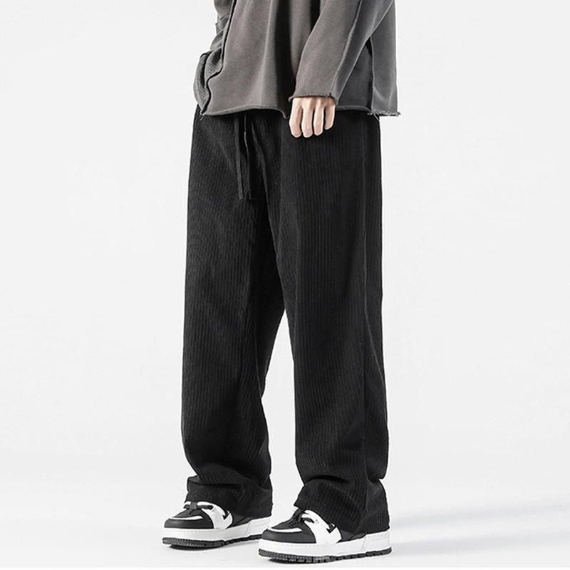 Corduroy Pants Men Baggy Sweat Slacks Elastic Waist Drawstring Casual Pants Cargo Y2K Pants with Pockets Black