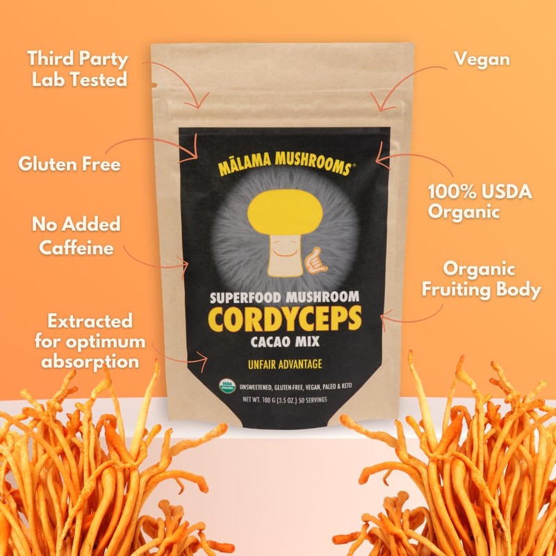 - Cordyceps Hot Cacao Mix: Get ready for the energy boost you've been looking for with our Cordyceps hot cacao mix. We use the fruiting-bodies of 100% organic Cordyceps and blend it with organic and fair trade cacao and ceylon cinnamon.