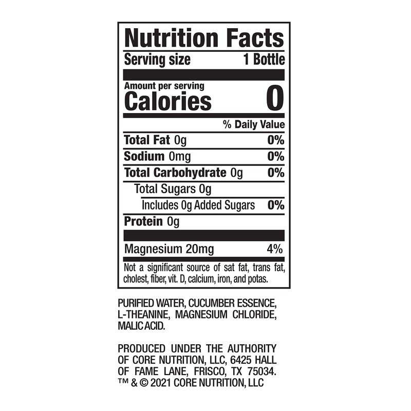 • NUTRIENT ENHANCED: Core Hydration+ Calm is infused with 400mg of L-theanine to help support relaxation while working with you to promote hydration. It also includes a 4% daily value of magnesium.