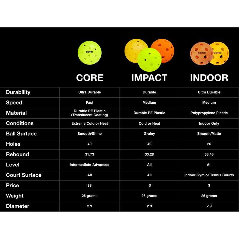 • 100% MONEY BACK GUARANTEE - We always put the customer first at CORE Pickleball. If you don't love our indoor pickleballs we'll give you back every penny, no questions asked*.
