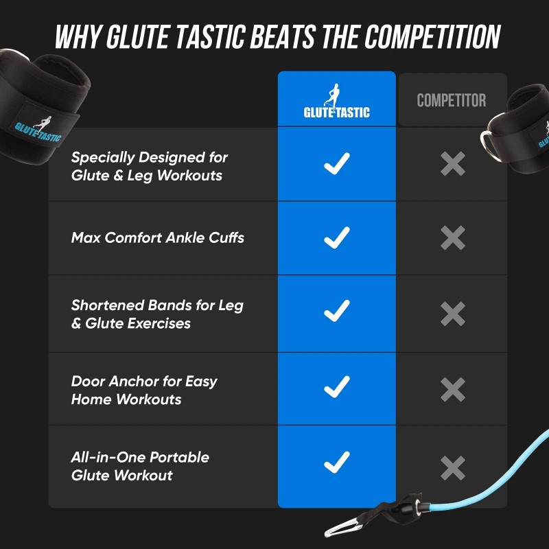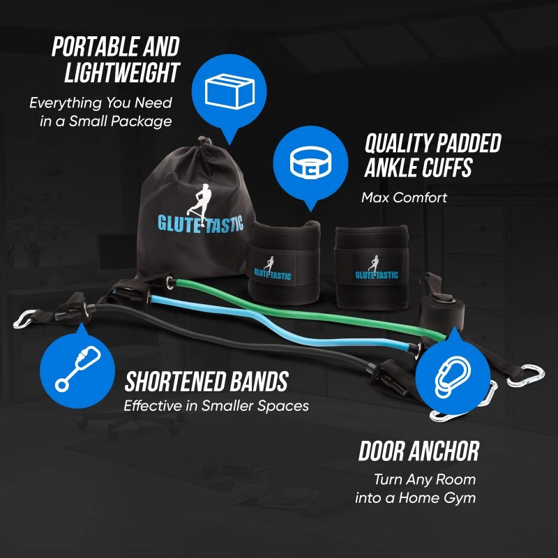 Premium Comfort and Strength - Our ankle resistance bands with cuffs are the most comfortable design on the market, which supports more intense workouts that create results. The Glute-Tastic has wide velcro design, double stitching and reinforced steel double D-rings to reduce stress, wear and tear. The adjustable resistance tubes offer varying weight options: Black: 24-26 lbs., Blue: 10-12 lbs., and Green: 15-20 lbs. Two bands can be used in combination if more resistance is desired.