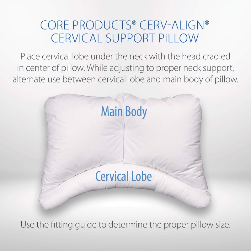 The Cerv-Align FIRM Cervical Support Pillow has both the firm support of an orthopedic pillow, and the comfort of a traditional sleeping pillow. Designed to help relieve headaches, neck pain, and muscle soreness, this pillow is commonly used to help manage a variety of conditions affecting the neck and shoulders. While back sleeping, the extra firm fiber filled neck lobe contours to fit the shoulders and provides even support across the shoulder line while the conventional pillow area comfortably supports the head. For side sleepers or those who prefer the comfort of a traditional fiber or feather pillow, simply rotate the support lobe away from the neck. The fiber filled area gently cradles the head with down-like comfort and can be used to adjust to sleeping on the firm cervical lobe. It may take some time to adjust to this cervical pillow and immediate overuse may increase neck pain. Those who slowly ease their way into orthopedic correction by alternating between this pillow and their current pillow achieve the best results. Select from three different lobe sizes for a custom fit. Covered with high quality cotton fabric for maximum comfort and durability. The Cerv-Align's exclusive fitting system ensures a proper fit for any body type. Fits a standard pillowcase. Made in the USA and contains no latex.