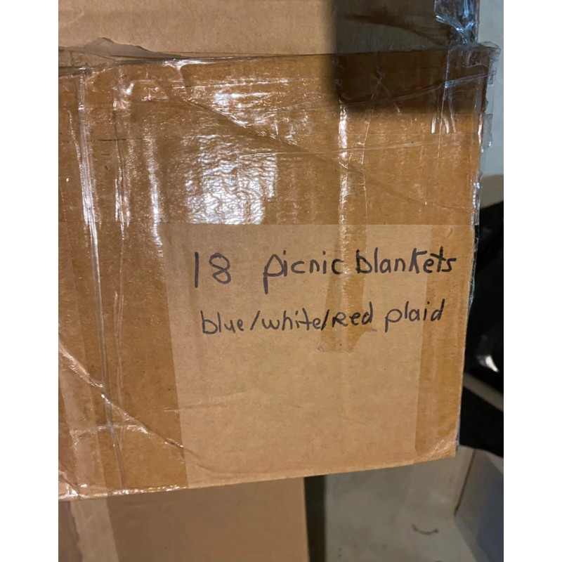 New blue plaid blanket made of polyester and flannel, perfect for outdoor activities. The blanket is made with high-quality materials for durability and comfort. It's machine washable and folds up into small rectangle with velcro closure and Handle for easy carrying. 18 available.