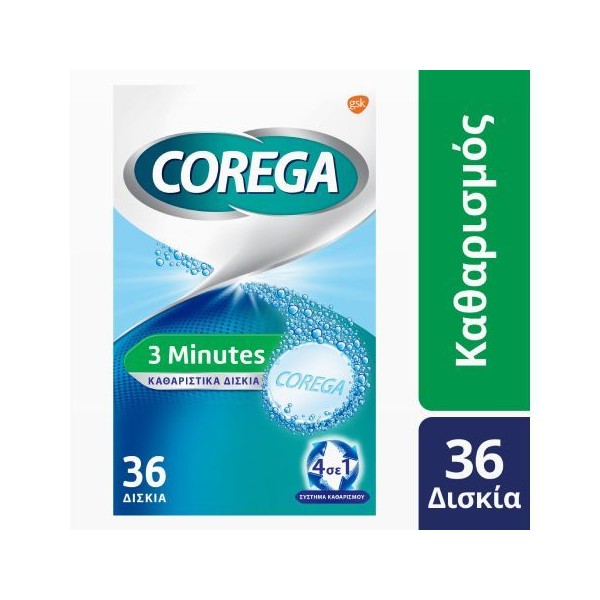 3 Minutes Denture Cleaners - 36tabs Corega 3 Minute Denture Cleaners have antimicrobial action and help you clean your denture effectively. Actions They fight 99.9% of the bacteria that cause bad breath in just 3 minutes. They help remove plaque and stains.