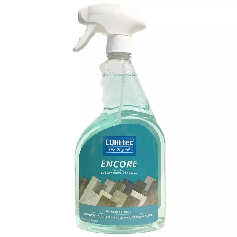 COREtec ENCORE by US Floors 03Z76 Floor Cleaner Care for Luxury Vinyl Flooring Ready To Use 32oz Spray Bottle. No need to rinse. Removes Tough Household Dirt, Grease & Scuffs. Brightens and Preserves Finishes. Leaves no Sticky or Dulling Residue. Safe for all types of Ceramic, Hardwood, Laminate & Resilient Flooring. Encore Luxury Vinyl Cleaner is specially formulated for cleaning all types of hard surface flooring. It is ideal for removing dirt, grease, and scuffs. This product is designed to be used full-strength as packaged. Do not dilute. No need to rinse. Coverage: Depends on how the product is applied. Approximate coverage is up to 2,000 sq. ft/quart.