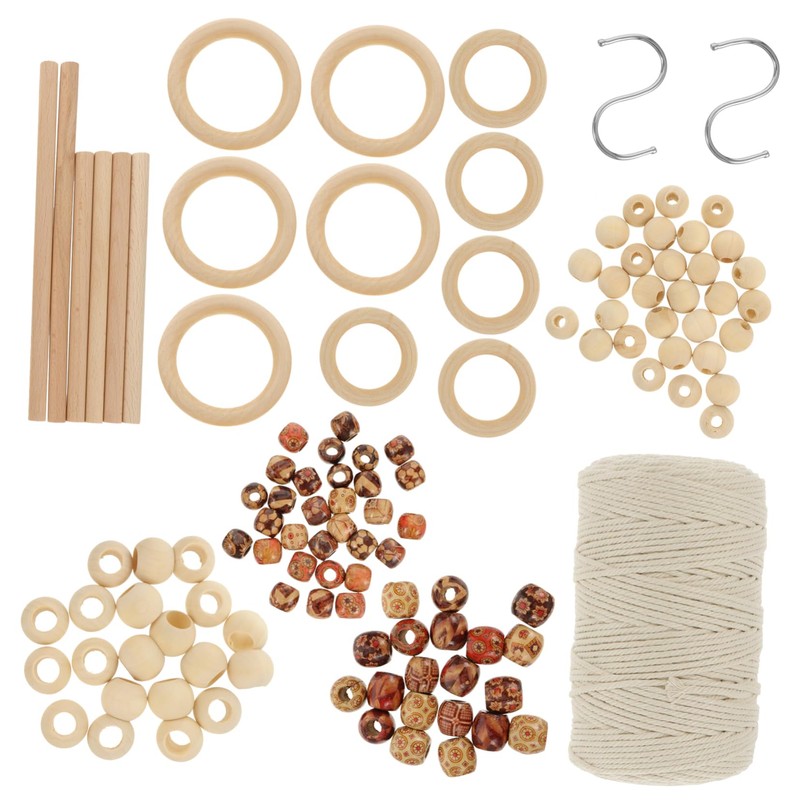 1 x Roll of 200 Cotton Rope 5 x 7cm Wooden Rings 5 x 5cm Wooden Rings 30 x 15mm wooden Beads 20 x 20mm wooden Beads 30 x 12mm Floral Pattern Beads 20 x 17mm Floral Pattern Beads 6 x Wooden Rods 2 x Hooks