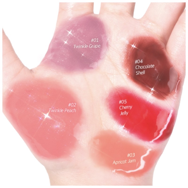 #G01 Twinkle Grape for a sweet violet sparkle, #G02 Twinkle Peach for a shimmering peach glow, #G03 Apricot Jam for a warm apricot tint, #G04 Chocolate Shell for a rich cocoa hue, and #G05 Cherry Jelly for a juicy cherry red. Perfect for wearing alone or layering over your favorite lipstick to add volume and shine.