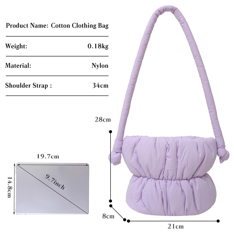 - Size and capacity: 21 x 8 x 28 cm (length x width x height). The lightweight puffer bag puffy bag has 1 main pocket and 1 inner zip pocket. The spacious space can hold wallets, lipsticks, keys, cards, sunglasses and mobile phones of different sizes, etc. This handbag meets most of your needs for storing everyday items.