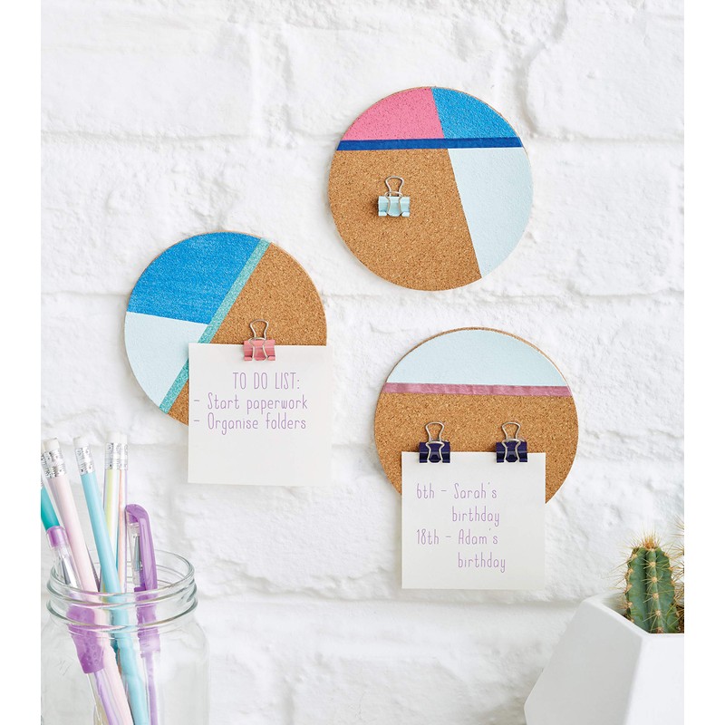 - Turn these cork coasters into cute little pin boards. You can decorate them with acrylic paints and add mini binder clips. You can display them on your wall and never forget those important events again.