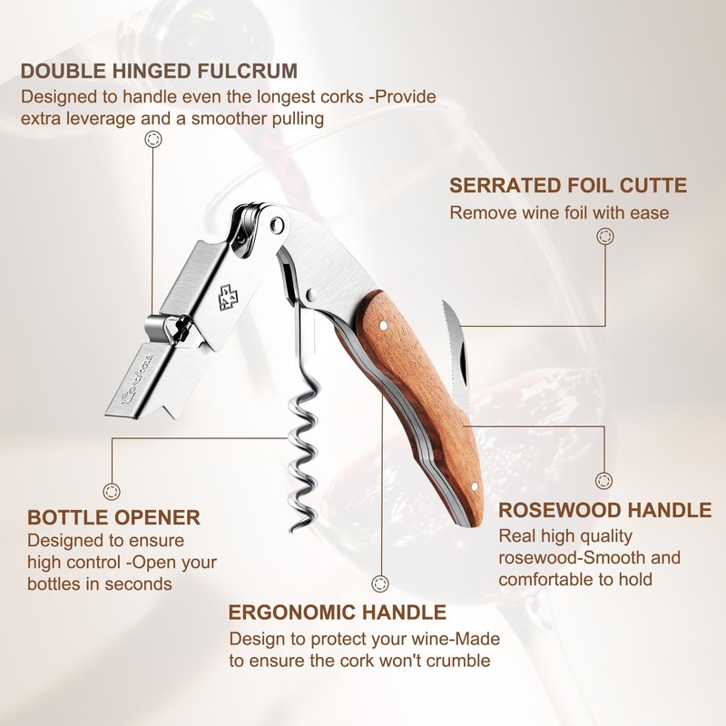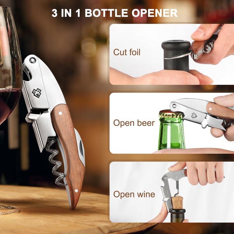 - (Uses high-quality stainless steel) The sommelier knife is made of high quality rust-resistant stainless steel, giving it a high quality stainless steel shine. The handle is made of very precious material that is durable and durable, and it is just the right thickness, size, and weight to fit in your hand from the moment you hold it, and it has a comfortable feel that you will want to use it for a long time