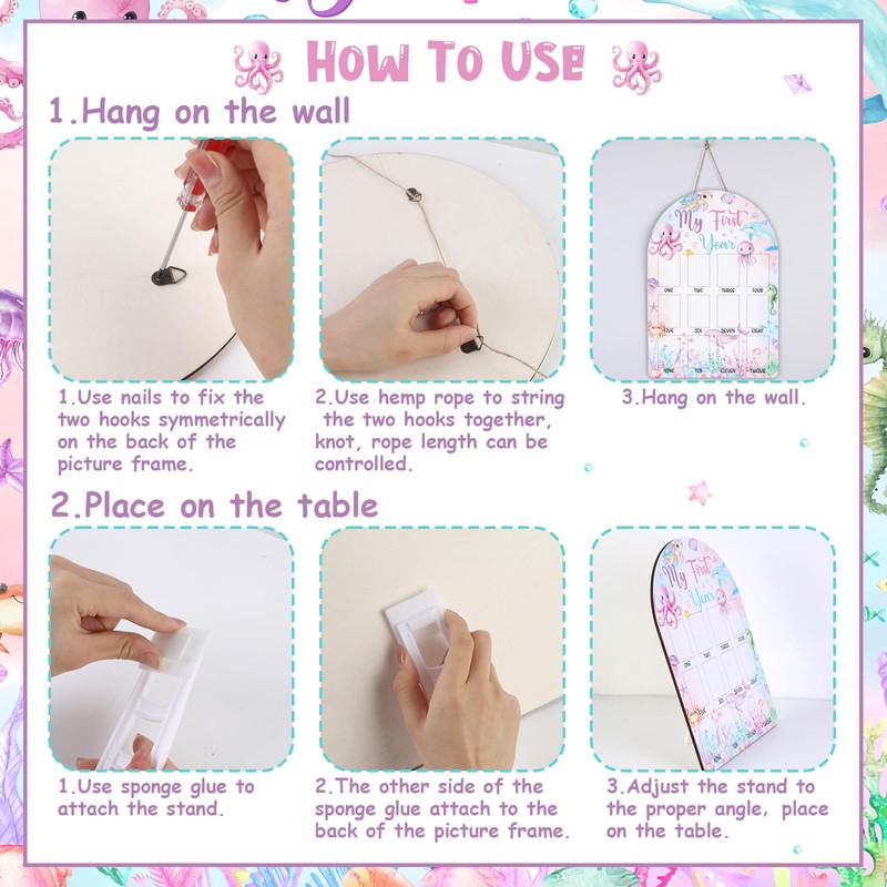 - What You Will Get: You will receive 1 piece of under the sea baby's first year photo frame, coming with hooks and rope for easy hanging, also come with photo frame holders and sponge glue for you to put your photos on the table.