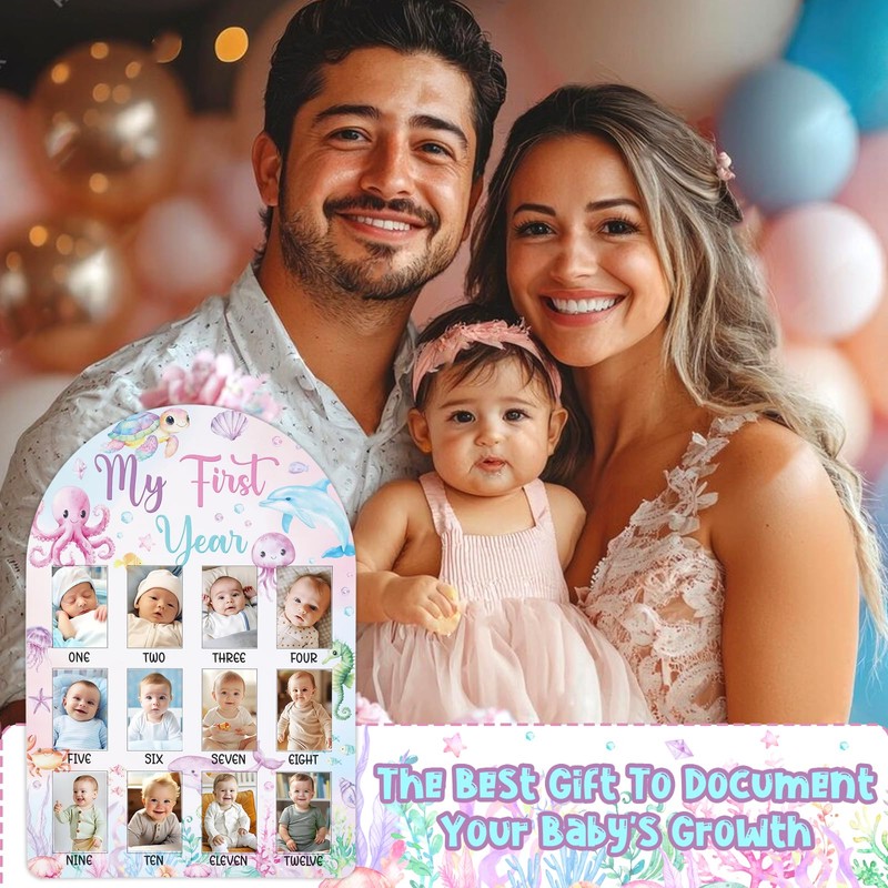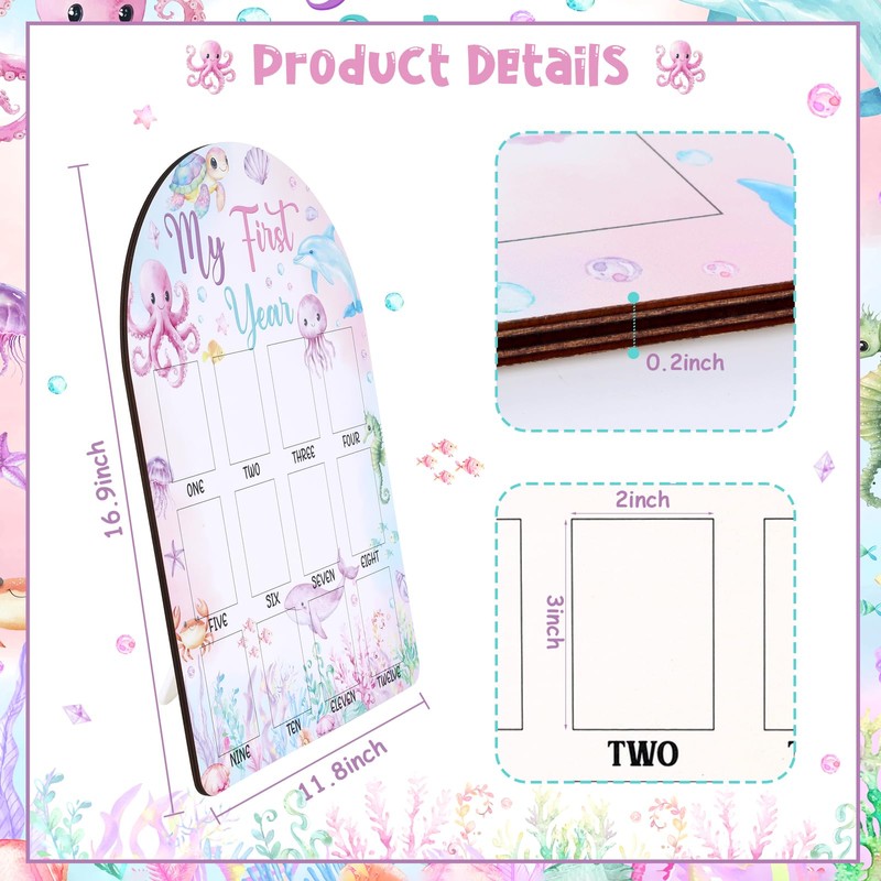 - Cute Keepsake Frame: Beautiful wood sign with under the sea pattern by UV printing. The adorable baby keepsake gift has 12 small photo frames to record and display your baby's monthly growth at the age of 1 year old. These newborn 12 months milestone sign also a gorgeous keepsake and photo prop in your baby’s 1st birthday party.