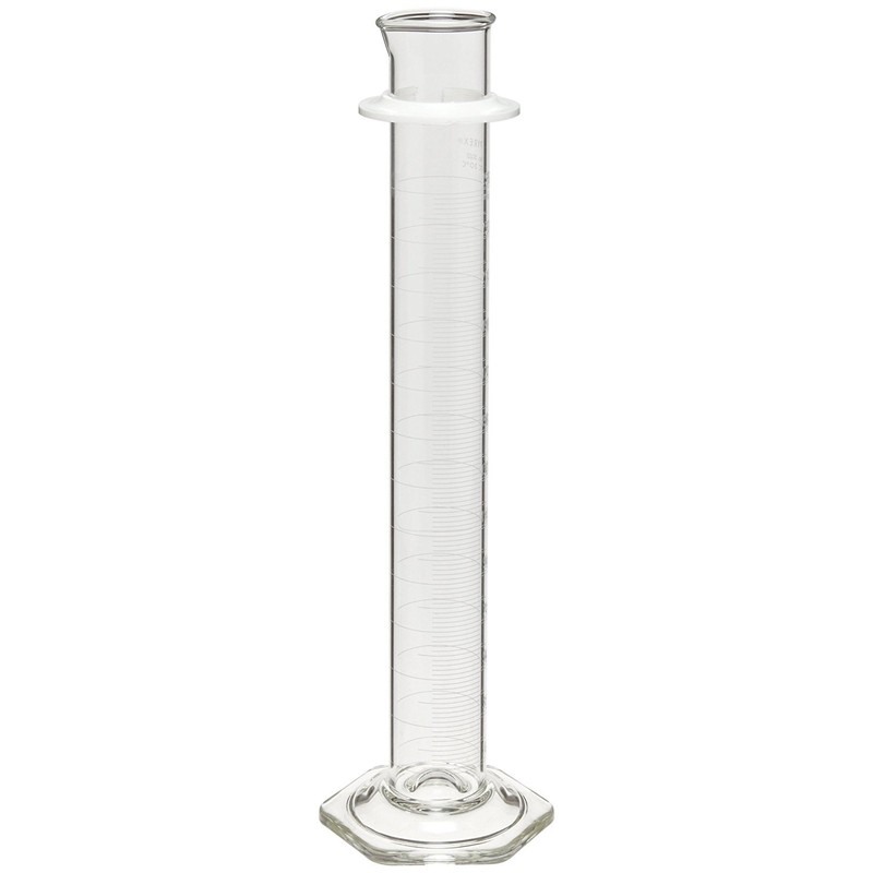 Corning Pyrex 50mL graduated cylinders are single-metric calibrated "To Contain" (TC) and have white enamel graduations. Height: approximately 225mm. Outer Diameter: approximately 24mm. Graduation interval: 1mL. Tolerance +/-: 0.5mL. Material: Borosilicate Glass Code 7740. Reusable. Not sterile. Pourout top. No stopper. Supplied with plastic bumper guards to reduce accidental breakage (for replacement bumper guards see Cat. No. 3066). 18/Case. Corning #: 3022-50.