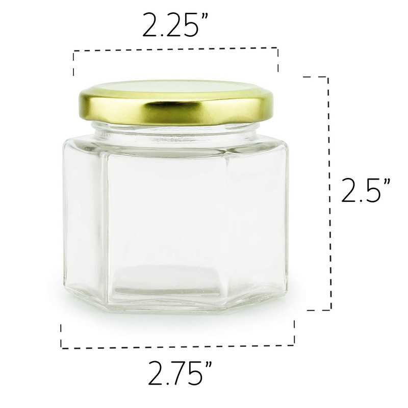 - ''' VALUE PACK OF 24: Receive 2 dozen hex jars and lids#||# SIZE: 2.5 inches tall; 2.75 x 2.5 inches wide; CAPACITY: 4 fluid ounces = 1/2 cup = 120 milliliters (maximum capacity)#||# PLASTISOL LINER: Lid lined with plastisol for hot fill applications, twist lug style (not screw)#||# MULTI-USE: Ideal for wedding and party favors, herbs and spices, jams and jellies for gifts, single serving food containers, samples, body creams, DIY candles or votive or tea light holders'''