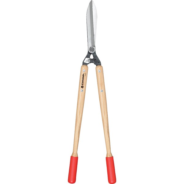 The Corona Clipper 8-1/2-Inch forged long Handle hedge shear with serrated blade features resharpenable, forged steel alloy blades, has bolted-on hardwood handles and is fully heat treated for strength. This professional hedge shear features a precision-made pivot bolt, serrated top blade, limb notch in lower blade for larger branches and ShockStop(r) bumper. The comfortable non-slip grips are ideal for extended use. The Corona HS 6930 has long 21-Inch handles, 8-1/2-Inch blade and comes with a lifetime warranty. Replacement parts are available.