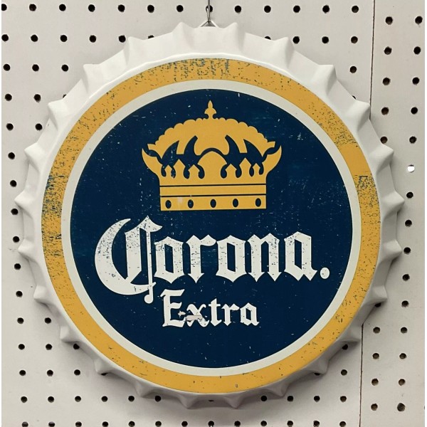 Add a touch of vintage charm to your man cave or garage with this Corona Tin Bottle Cap Sign. Measuring 13 3/4 inches in diameter and 1 3/4 inches wide, this sign features the iconic Corona beer logo and is perfect for collectors of breweriana. The sign is made of durable metal and has a rustic, distressed look that adds character to any space. It's a great addition to any bar or man cave and is sure to be a conversation starter.