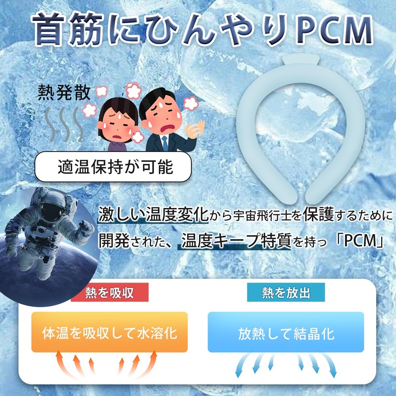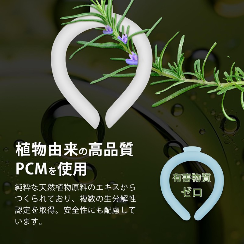 - [Features] [1] Naturally freeze below 86°F (28°C). Neck ring with PCM that frozen water soluble gel that freezes under 86°F (28°C); 2) It does not sweat and is comfortable unlike ice, so it does not sweat so your neck stays dry and comfortable at all times. 3) Maintains moderate cooling. Prevents excessive cooling, absorbs body heat and cools down comfortably. 4: It can be used repeatedly over and over 666°F (28°C). and freeze, so you can cool it. Can be used repeatedly. 5: No power supply or battery required, so it is an economical and eco-friendly heatstroke prevention