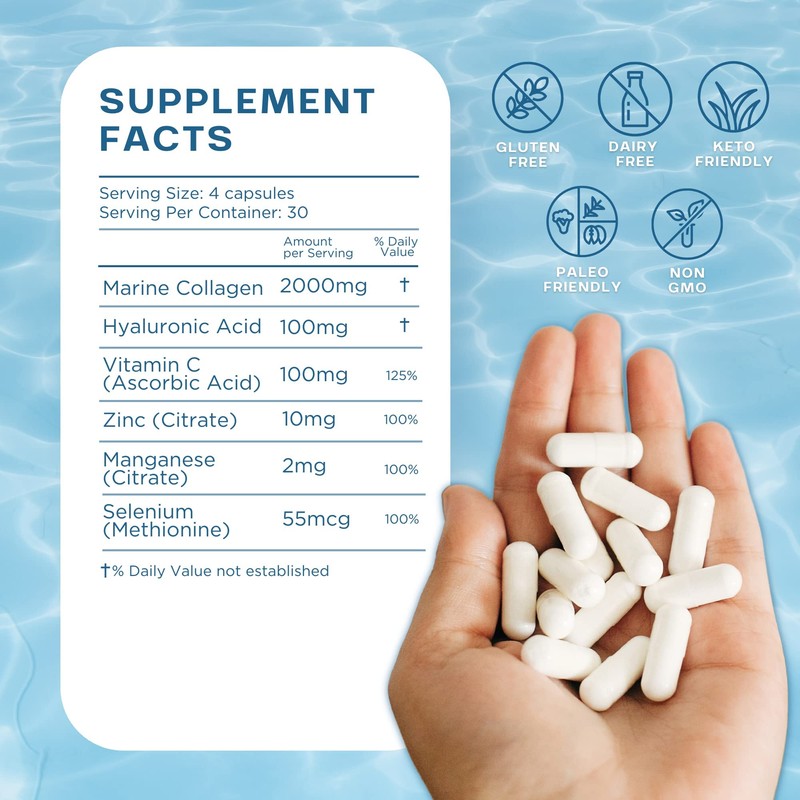 - ENHANCED RESULTS: The effectiveness of the Collagen capsules is further enhanced with a Collagen Boosting complex of high dose of vegan Hyaluronic acid, Vitamin C, Zinc, Selenium and Manganese.