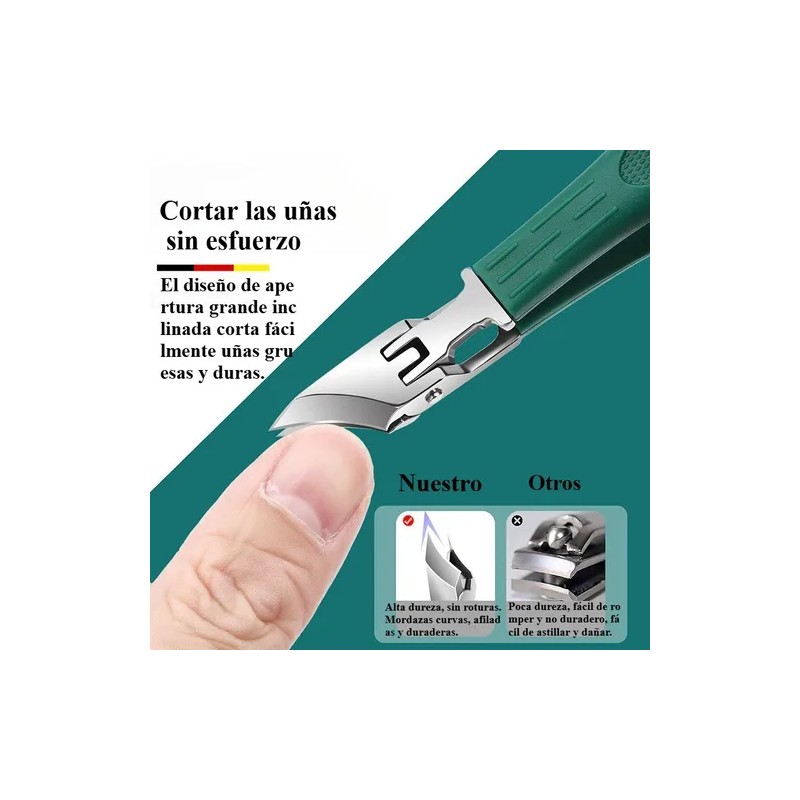 - Una sola pieza antisalpicaduras: recoge automáticamente los recortes de uñas sin que salgan volando