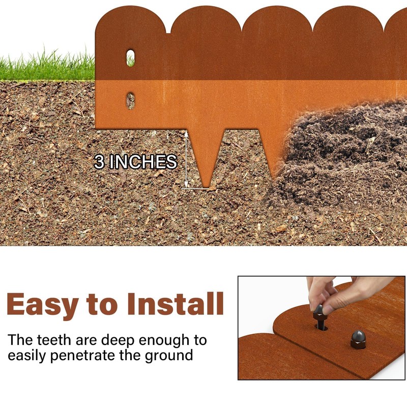 - Bendable & Easy to Install : The heavy duty metal landscape edging features good toughness and can be bent at will to adapt to the curve of your garden, no cutting required. The 8 inches slice teeth of the metal lawn edging are deep enough and go easily through the ground, simply align the holes in the two metal edging and screw them in for a tight connection that won't come off easily