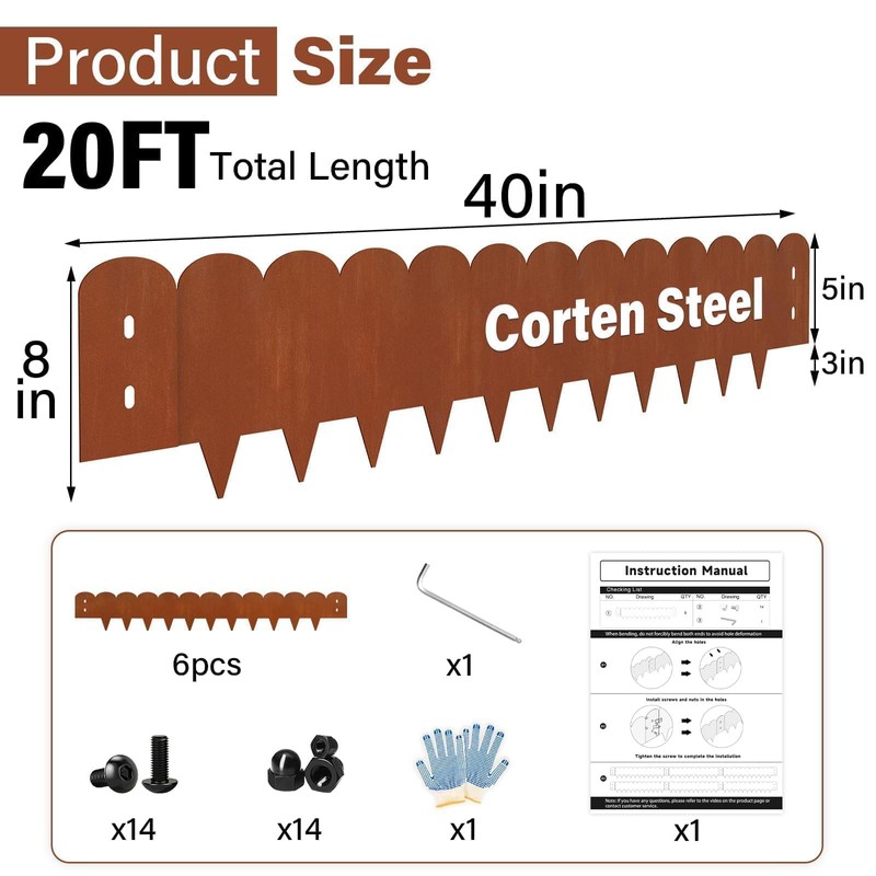 - Steel Edging Size: The metal garden edging is 8 inches tall, length is 40 inches, 6 pack / Set. The garden edging border total length is 20FT. Accessories: 14 pairs of screws, a wrench, instructions, a pair of gloves. Gloves can protect hands when installing landscape edging border