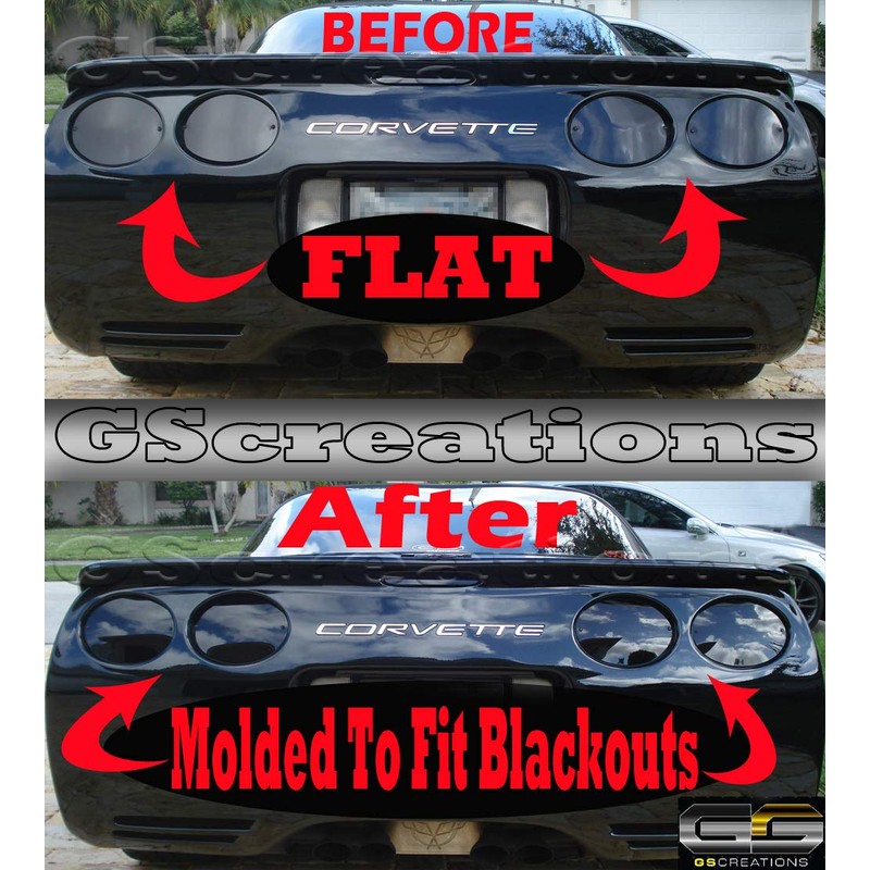 These are a brand new design for GScreations, your #1 Corvette blackout manufacture!**** Seven Piece Rear Blackout Kit What you will get: 4- MOLDED Taillights covers 2 -Reverse lights covers 1- 3rd brake light cover Don't be fooled by other kits that are only 4 pieces and are the same price!! Years: 1997 to 2004. Fits: C5 and ZO6 Material: Acrylic Why molded are better than flat covers: We can let the pictures below do the talking but you will notice right away how our molded blackouts reflect a true image rather then a distorted reflection like the flat blackouts. Your tail lights are curved why should your blackouts be flat? The flat blackouts make your tail lights look bigger than they really are.We switched our own C5 from flat to the new molded kit, you should too! Installation: Taillights re-use the factory screws for a tight and secure fit (much harder to steal then the other kits that use velcro, wont fall off either) Reverse light covers and 3rd brake light cover use heavy duty 3m double sided tape to securely attach them This means you will not see the tape outline when the third brake light is on or when the reverse lights are on.CLEAR Our lens covers are molded to the curve of the factory tail lights. A perfect fit. Complete color install instructions are provided. When you turn on your parking lights or use your brake lights they are still highly visible through the blackout covers.