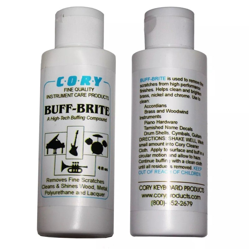Not only for pianos, Buff-Brite works easily on guitars, drums, cymbals, band instruments, high gloss and satin ebony pianos, synthesizers, instrument hardware, and tarnished name decals. Buff-Brite cleans without leaving a greasy film. Excellent for deep cleaning fingerprint oils from poly and lacquer satin ebony finishes.