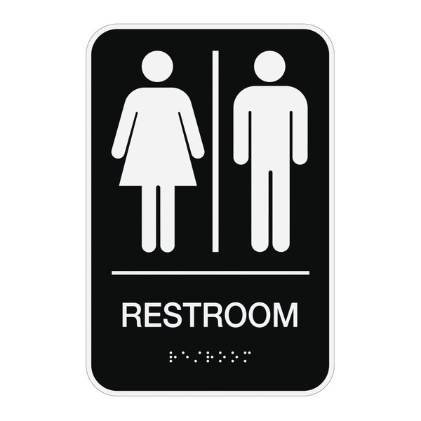 - Sign features a man and woman symbol along with a raised Braille message