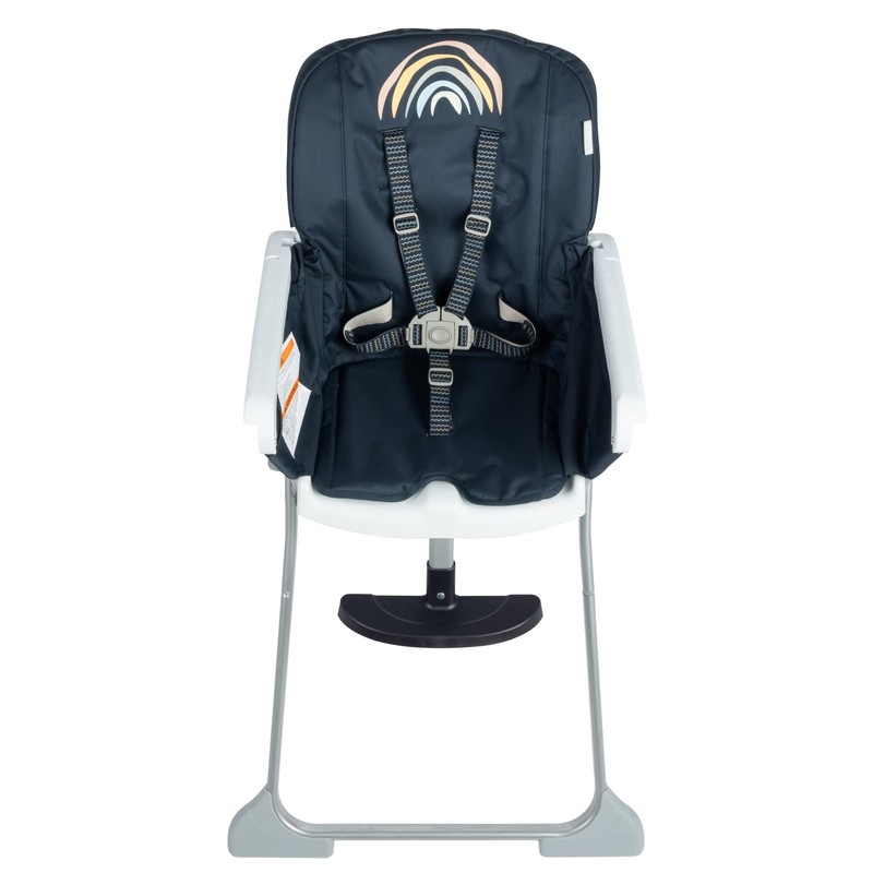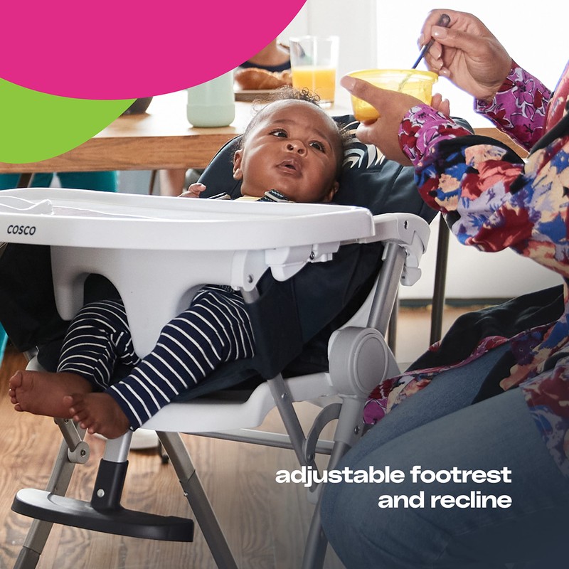 The Cosco Kids? Simple Fold? Adjustable High Chair folds flat and stands on its own, making it easy to tuck in the closet or bring with you anywhere. The adjustable footrest and recline, and the full-size, 3-position adjustable tray grow with your child as they need it. With the wipeable seat pad, clean-up is easy after messy meals. The no-nonsense design sets up in just seconds, so you can focus on meal prep and making memories. For use up to 50 lbs., the 5-point harness keeps your baby and growing-toddler secure.