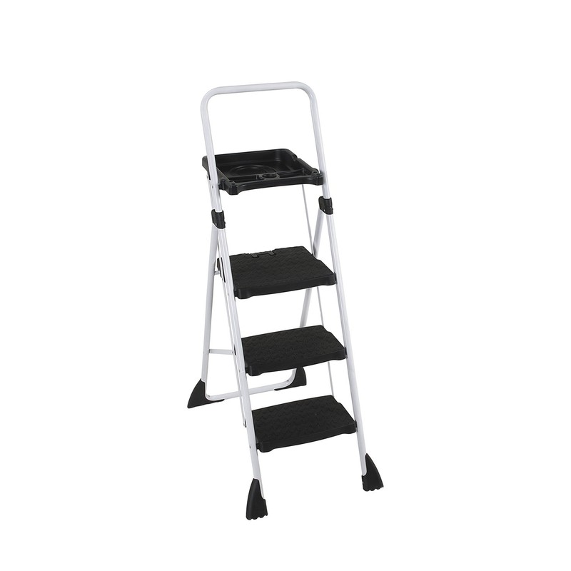 Heavy-duty steel framed step stool features heavy-duty injection molded steps with large locking top platform step. New 1 hand fold and lock release. Continuous rear leg support adds strength and stability. Stabilizing feet add to the safety. Extended hand-grip handle provides extra security. Deluxe contoured tool tray helps balance paint cans and folds down for storage. 2-position paint tray attachment points come with paper towel brackets and slots to hold screwdrivers, etc. Step depth: 10 In., 10 In., and 12 In. Width: 14-3/4 In. total open height is 55-1/2 In. Total folded height 61-1/4In. Meets ANSI standards for Type II duty rating, load capacity 225 Lb. 10 year manufacturer's warranty.