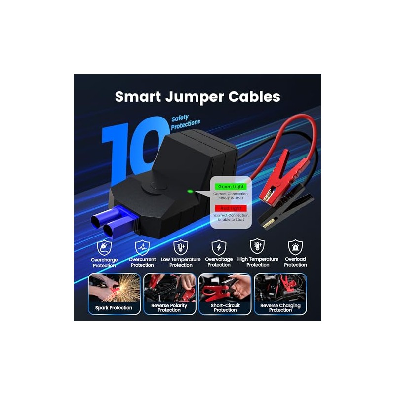 - SMART JUMPER CABLES WITH 10 SAFETY PROTECTIONS: Including reverse polarity, anti-spark, short-circuit, and reverse charging prevention―with real-time visual alerts. A unique 3-second manual override button activates DC mode when automatic detection fails, ensuring safe and foolproof use for car owners and professionals alike.