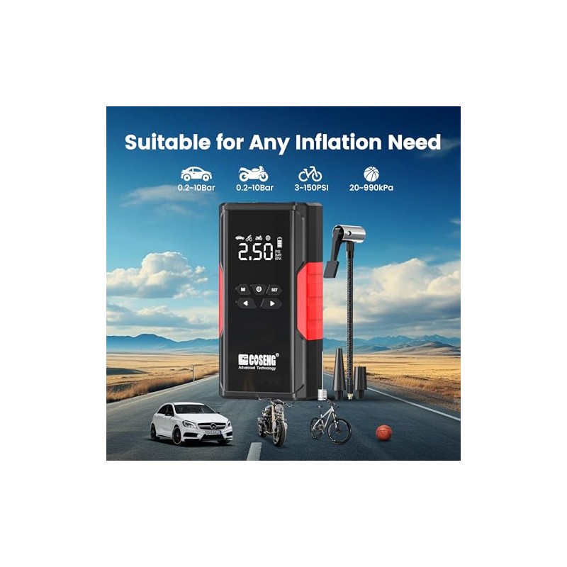 - POWERFUL PORTABLE JUMP STARTER: Reliably jumpstart 12V batteries for cars, trucks, motorcycles, lawnmowers, SUVs, snowmobiles, boats, and more―even in extreme temperatures (-4°F to 140°F). With a high-performance 10,000mAh lithium battery capable of 2000+ charge cycles, the Coseng J26 supports up to 6.0L diesel and all gasoline engines, ensuring dependable power for every emergency.