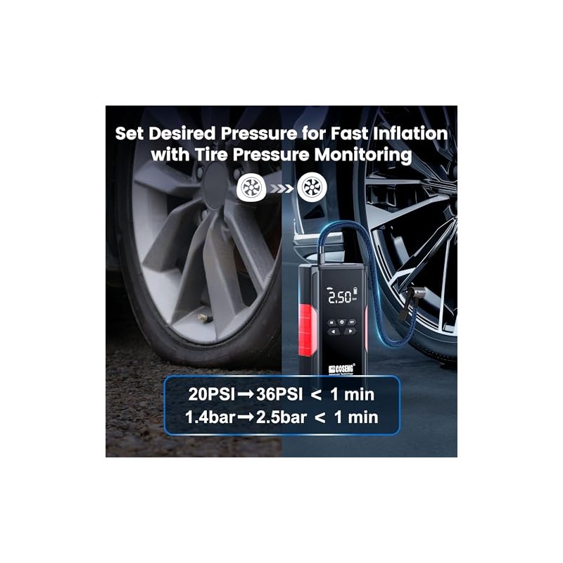 - FAST & PRECISE AIR PUMP: Built-in 150PSI air compressor quickly inflates car, motorcycle, and bicycle tires with precise digital pressure monitoring. It offers 4 preset inflation modes and 3 pressure units (PSI, KPa, Bar). Simply set your desired tire pressure, and the portable air pump inflator automatically stops at the preset value, ensuring convenient and accurate inflation during travel and outdoor adventures.