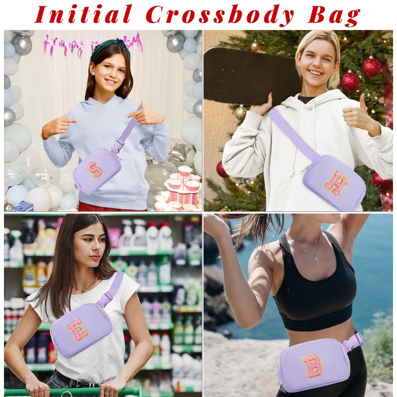 - [Initial Belt Bag Letter Fanny Pack Crossbody Trendy for Girls] Small purple lavender belt bag with puffy chenille glitter letter patch A for her initials; versatile cross body sling bag and fanny pack for girls must have outdoor accessories storage carrying.