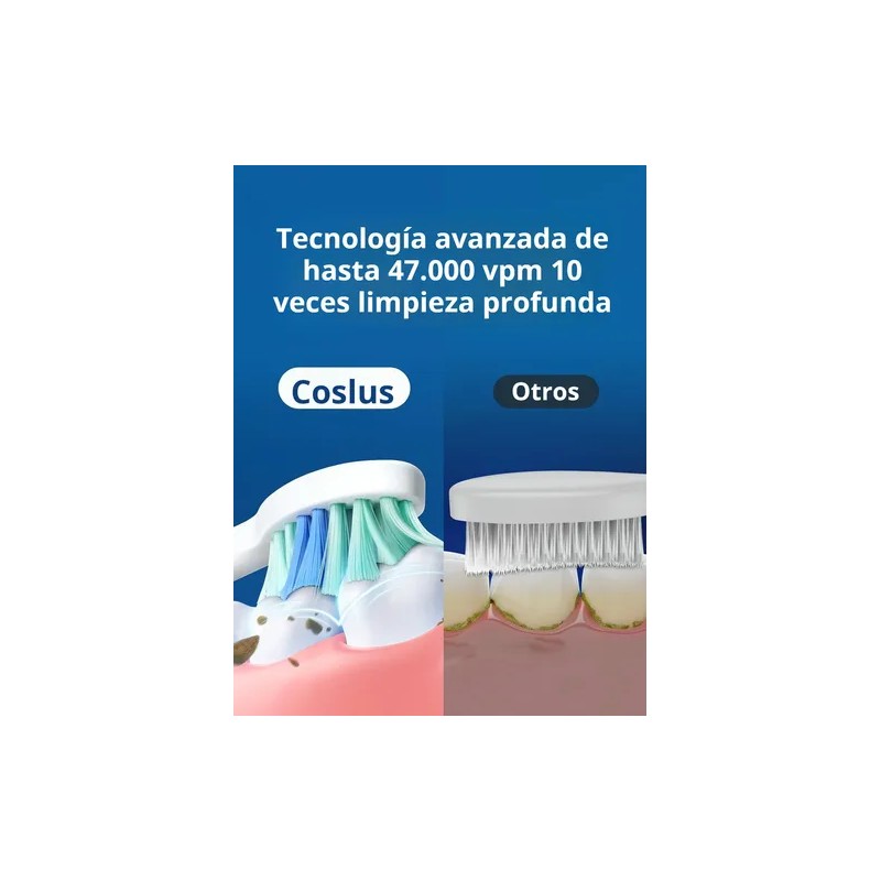 Tecnología avanzada 47000 vpm, limpieza profunda 10 veces: cepillo de dientes eléctrico para adultos coslus con tecnología avanzada 47000 vpm, reconocido profesionalmente por el equipo dental estadounidense. Elimina 10 veces más la Placa dental inalcanzable que otros cepillos de dientes y proporciona una limpieza profunda. El cepillo de dientes eléctrico coslus para viajes para adultos puede hacer que sus dientes sean más blancos, su aliento sea fresco y sus encías sean más saludables en una semana.