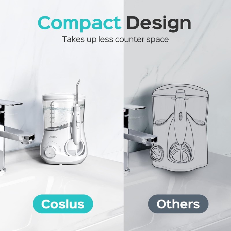 - COMPACT & SPACE-SAVING DESIGN: With its compact, sleek structure, this countertop water flosser minimizes countertop space usage without compromising on functionality. It is the ideal choice for family bathrooms, countertops, or tight spaces. Its modern and refined appearance enhances practicality while adding a touch of elegance to your home. Perfect for small-space dwellers, it provides a practical solution for those with limited space while maintaining high performance