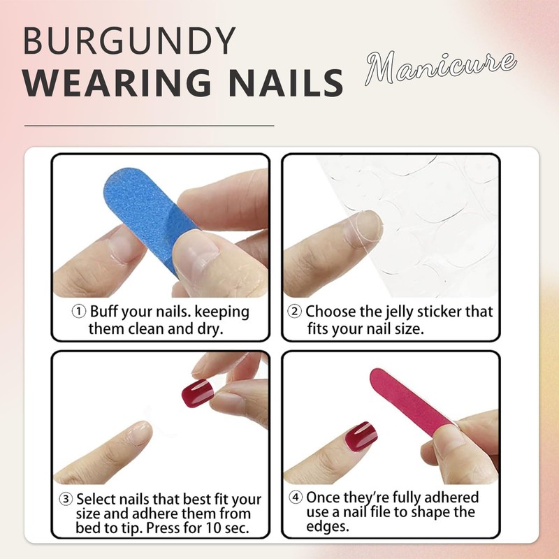 4.Langanhaltender Effekt: Die Kunstnägel sind wiederverwendbar, wobei der Jelly Glue schnell und einfach entfernt werden kann. Für eine längere Haltbarkeit von ein bis zwei Wochen können Sie außerdem Ihren eigenen Kleber verwenden. Dies gibt Ihnen die Flexibilität, die Nägel mehrere Male für verschiedene Anlässe zu nutzen, ohne Qualitätseinbußen