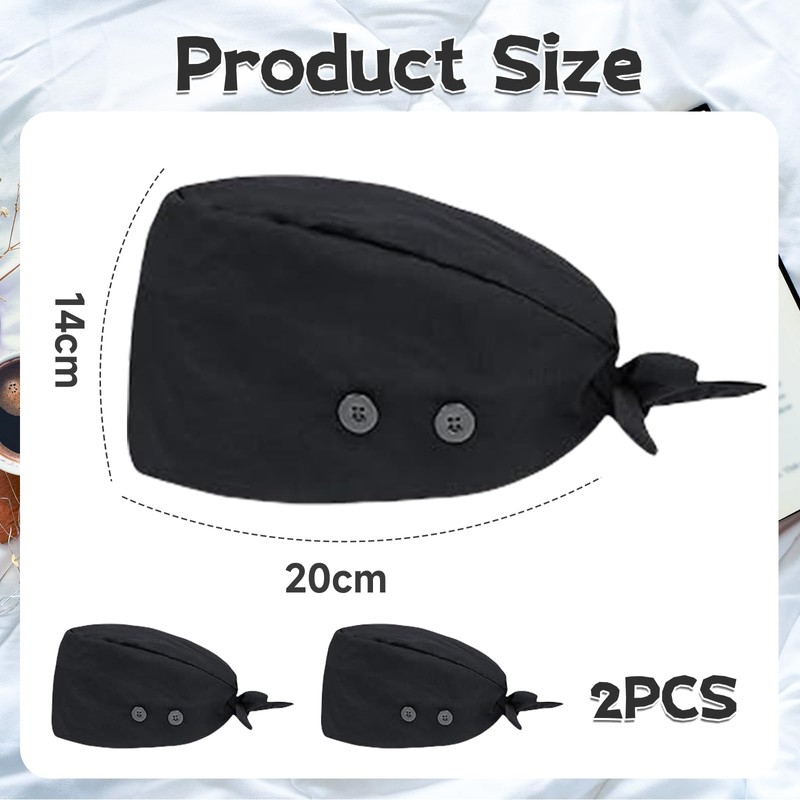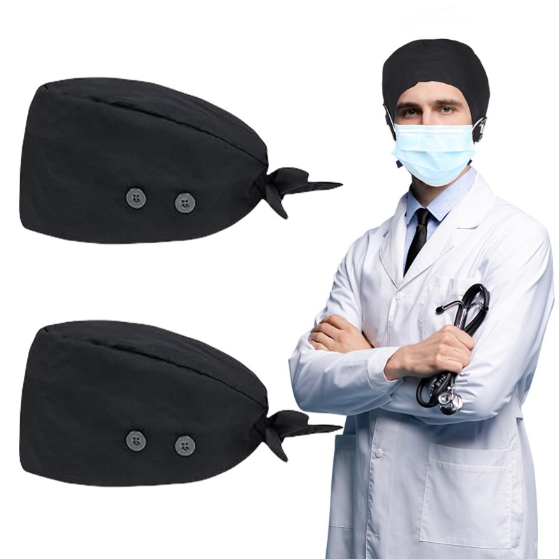 • Integrated mask holder: Experience relief from ear pain with our innovative surgical cap, which has four strategically placed buttons. These buttons are used to securely fasten your mask and ensure less pressure on your ears. So you can feel comfortable throughout your shift and concentrate on your work