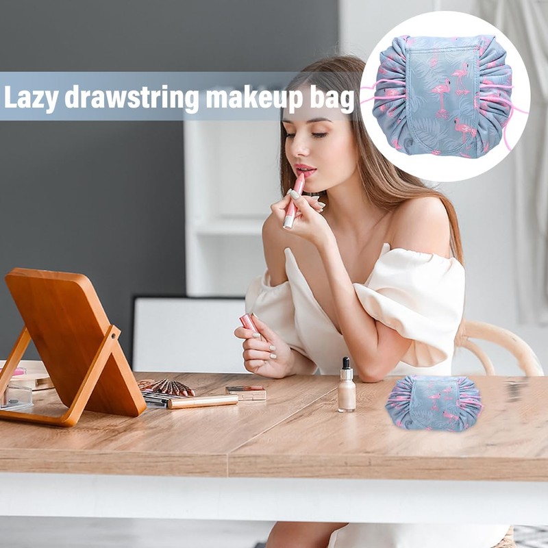 Cosmetic Bag with Drawstring, Quick Makeup Bag, One-Step Organiser Makeup Bag, Make Up Bag, Travel Cosmetic Bag, Portable Large Cosmetic Bag with Flamingos, for Lazy Women and Girls