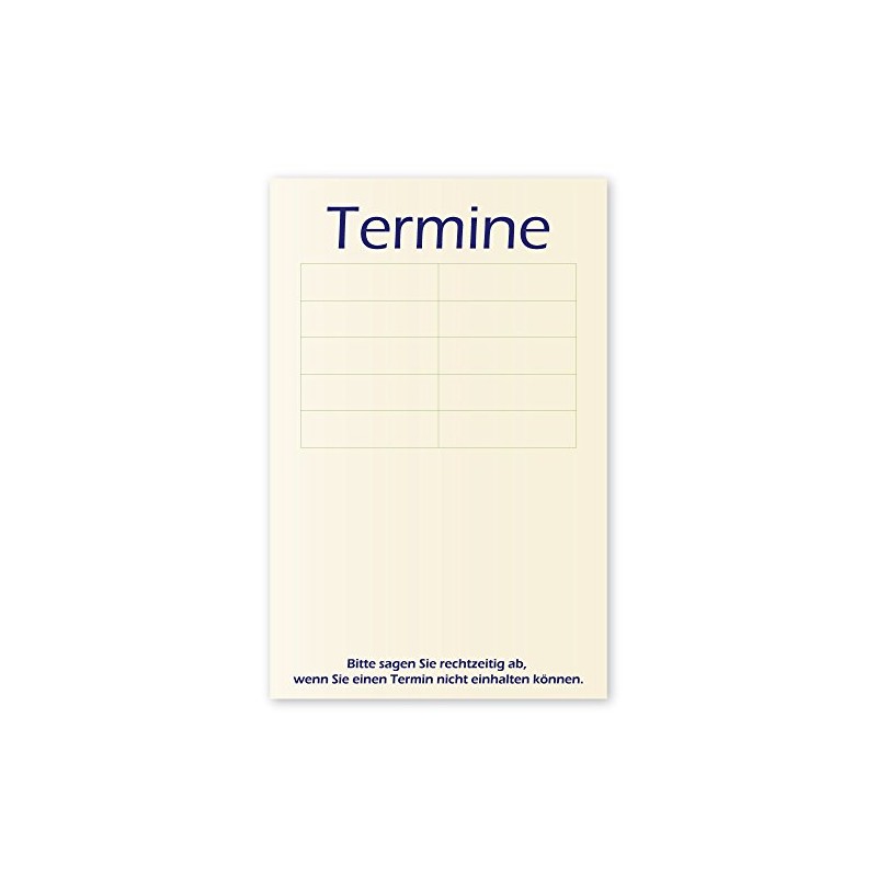 - Reusable: the appointment cards are made of solid cardboard and offer space for 5 appointments. The dates are entered on the back, there is also space for a stamp with an imprint size of 50 x 30 cm.