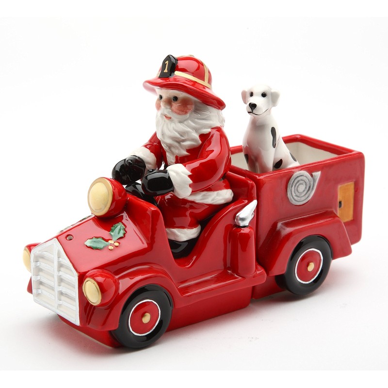 Cosmos Gifts 10263 Ceramic Christmas Santa on a Firetruck Salt and Pepper Shaker with Dalmation Sugar Pack Holder Car (Set of 3), 5-5/8" L