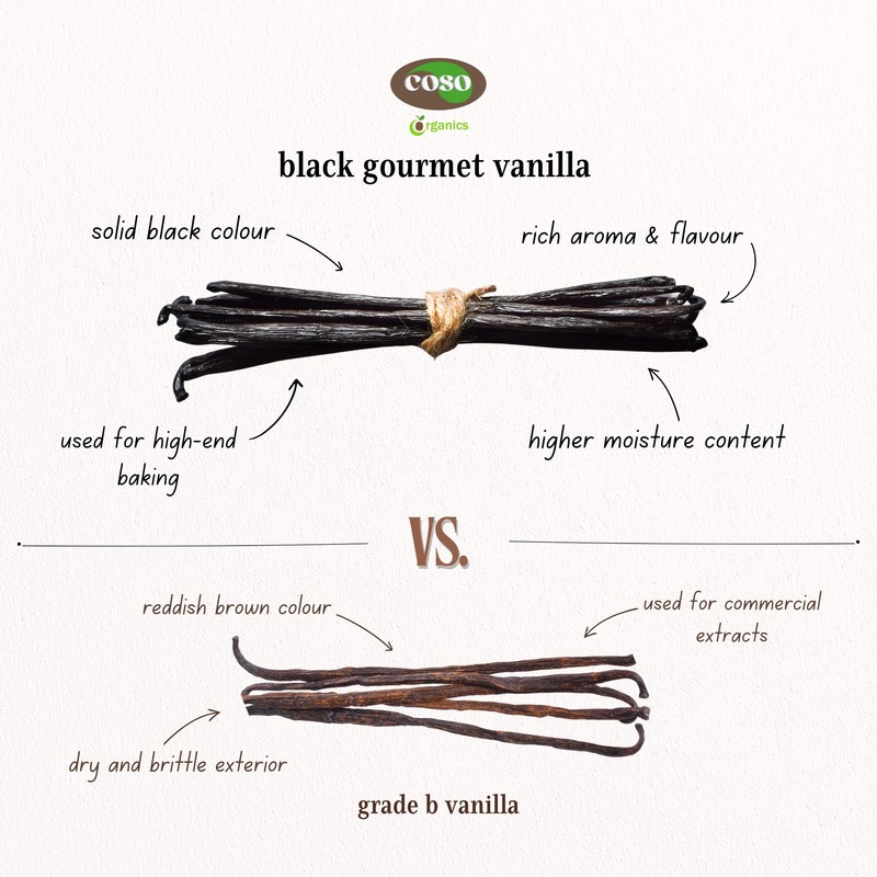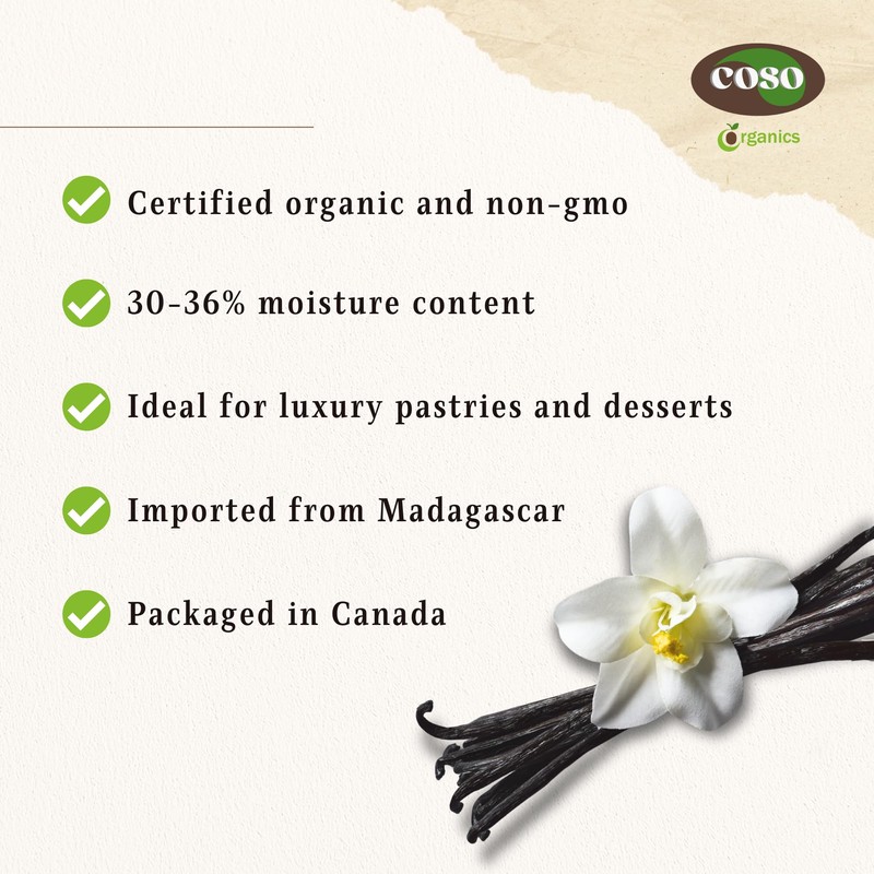 Add an enticingly rich aroma and deep, complex flavor to your favorite pastries, desserts, and infusions with COSO Organics’ Grade-A organic vanilla beans. Our premium vanilla is sourced directly from a partner farm in Madagascar’s SAVA region — the birthplace of the world’s finest Bourbon vanilla. With over 33 years of experience, our farming partner has perfected the curing and selection process to deliver vanilla of exceptional quality and potency. We select only Grade A vanilla beans — long, plump, and glossy, filled with fragrant black caviar (vanilla seeds). These beans are moisture-rich (30–36%), making them supple, aromatic, and ideal for baking, homemade extracts, brewing, and more. Expect a warm, inviting aroma and a complex flavor profile with notes of caramel, floral sweetness, and dried fruit. Madagascar Bourbon vanilla is celebrated by chefs and artisan bakers for its smooth, balanced intensity and authentic taste. To preserve their full aroma and texture, our beans are vacuum-sealed for freshness, locking in moisture, oils, and flavor — no dryness, no additives, just pure, organic vanilla pods. Whether you're a home baker, chef, or craft beverage maker, COSO Organics delivers the flavor your recipes deserve — direct from Madagascar, with integrity and care in every pod.