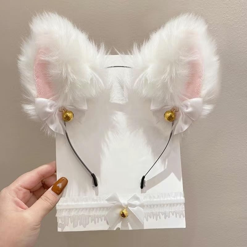 - ADORABLE DESIGN: Plush cat ears headband set featuring soft faux fur construction in black or white options with decorative satin bows and golden bells