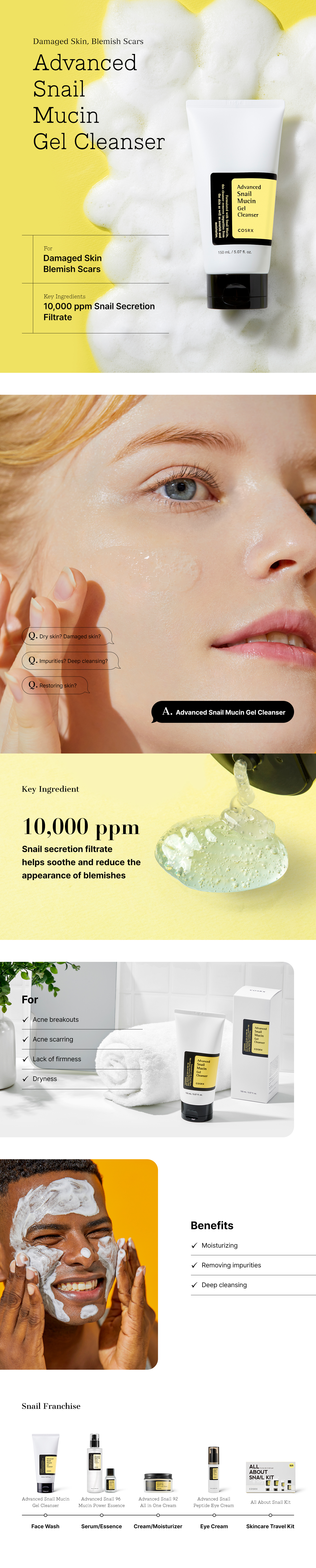 COSRX Advanced Snail Mucin Gel Cleanser is designed to alleviate damaged skin and blemish scars. This product is specifically effective for dry and damaged skin types that need deep cleansing of impurities. It also helps restoring skin, along with removing acne breakouts, acne scarring, and enhancing skin firmness and moisturizing.