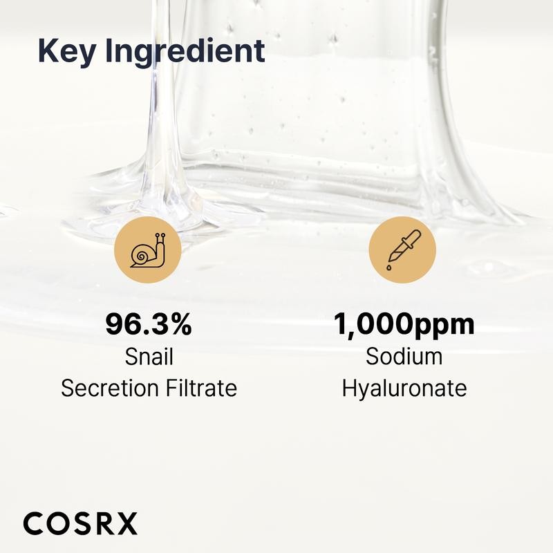 1. Formulated with 96.3% Snail Secretion Filtrate, this essence repairs and rejuvenates dry, aging skin. Skin is brighter, revitalized, and soothed.