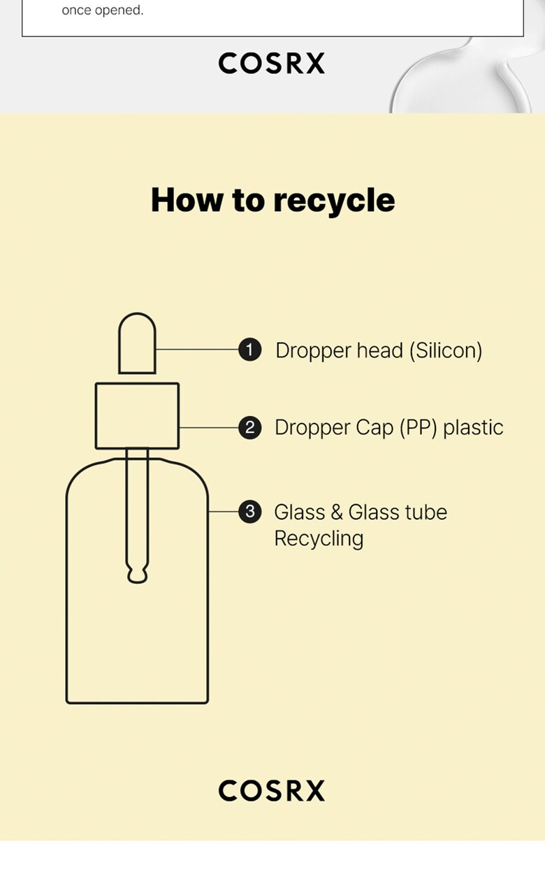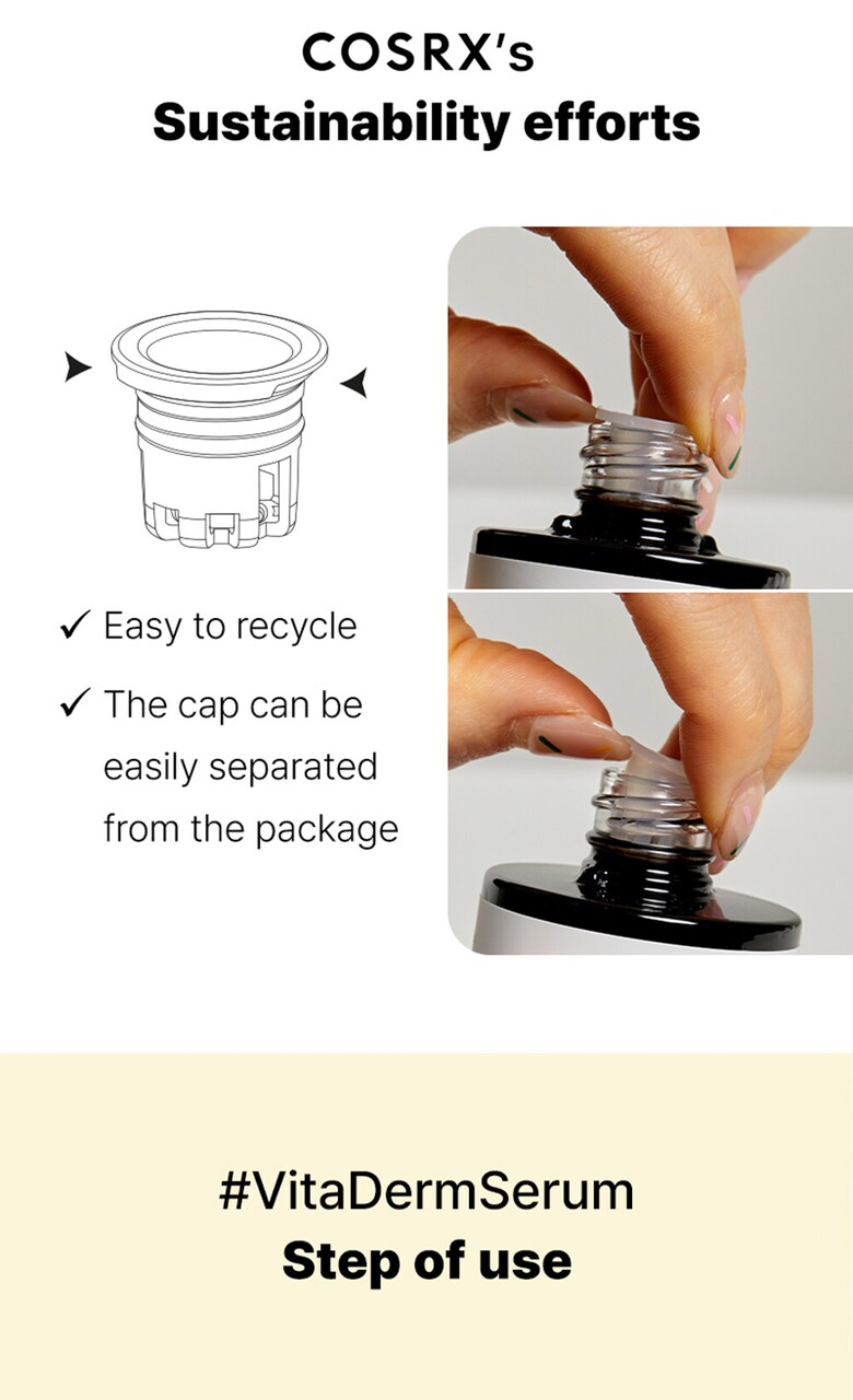The research-based derma line of COSRX was born, a prescription solution that optimally blends customized high-efficiency ingredients to solve skin problems and delivers them safely and effectively to the skin. This is the Derma Vita Serum highly praised by YouTuber Director Pi. Hwahae direct survey group results show that 95% of them were satisfied with the product in terms of spreadability, finish, and absorbency. We have developed a low-irritation, high content vitamin C serum that reduces irritation and maximizes the effect. As a light water-based essence type, it adheres to the face to minimize irritation and brightens the skin. It is recommended for those who are sensitive to blemishes caused by UV rays, those who want to brighten their dull skin tone, and those who are concerned about wrinkles. The product provides four skin conditioning effects: skin elasticity improvement, irregular tone correction, wrinkle improvement, and vitality/shininess improvement. Dispose of the dropper head as general waste, the dropper cap as plastic, and glass tubes and containers as glass.