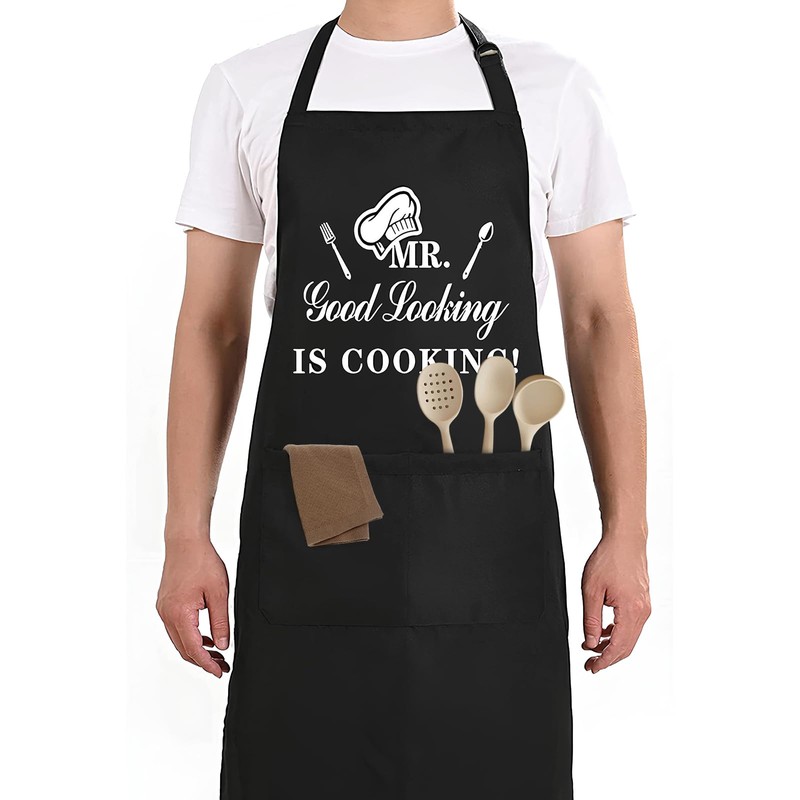 - Funny cooking gifts: funny pattern, letters "MR GOOD LOOKING IS COOKING" design. Increase the joy of cooking. The print effect is clear and bright. This is the perfect gift for cooking enthusiasts. This cooking apron is suitable as a gift for men, dad, husband, boyfriend, grandfather on Father's Day, Christmas, birthday, Valentine's Day.