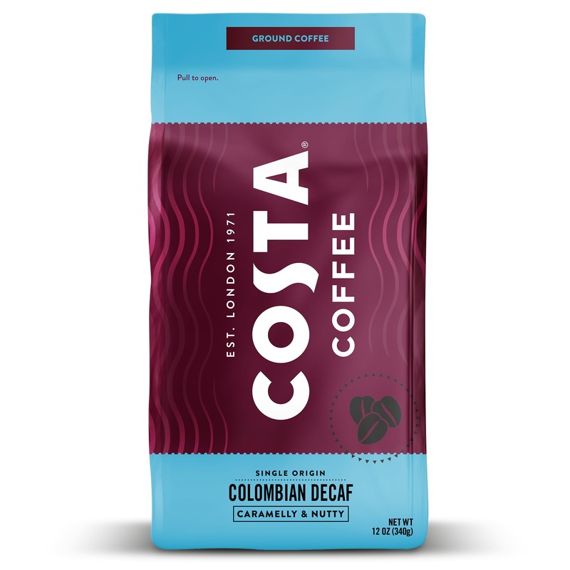 Costa Coffee Ground Coffee, Colombian Decaf Medium Roast, 12oz each, Rainforest Alliance Certified