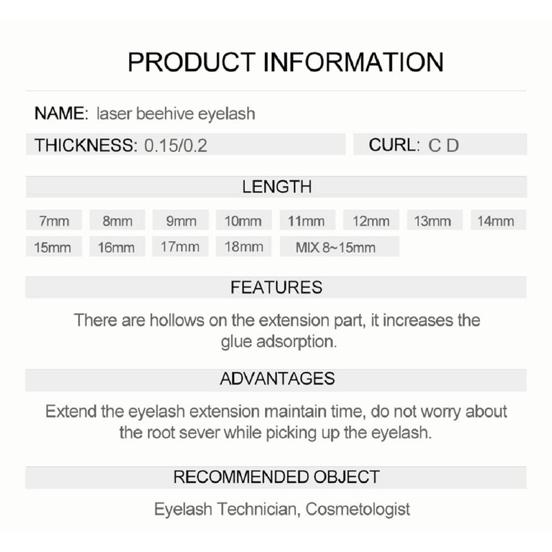- Laser Technology: There are hollows on the lash extensions part, it increases the glue adsorption and prolong the effect of eyelash extensions, laser beehive hollows extend the eyelash extension maintain time, do not worry about the root sever while picking up the eyelash
